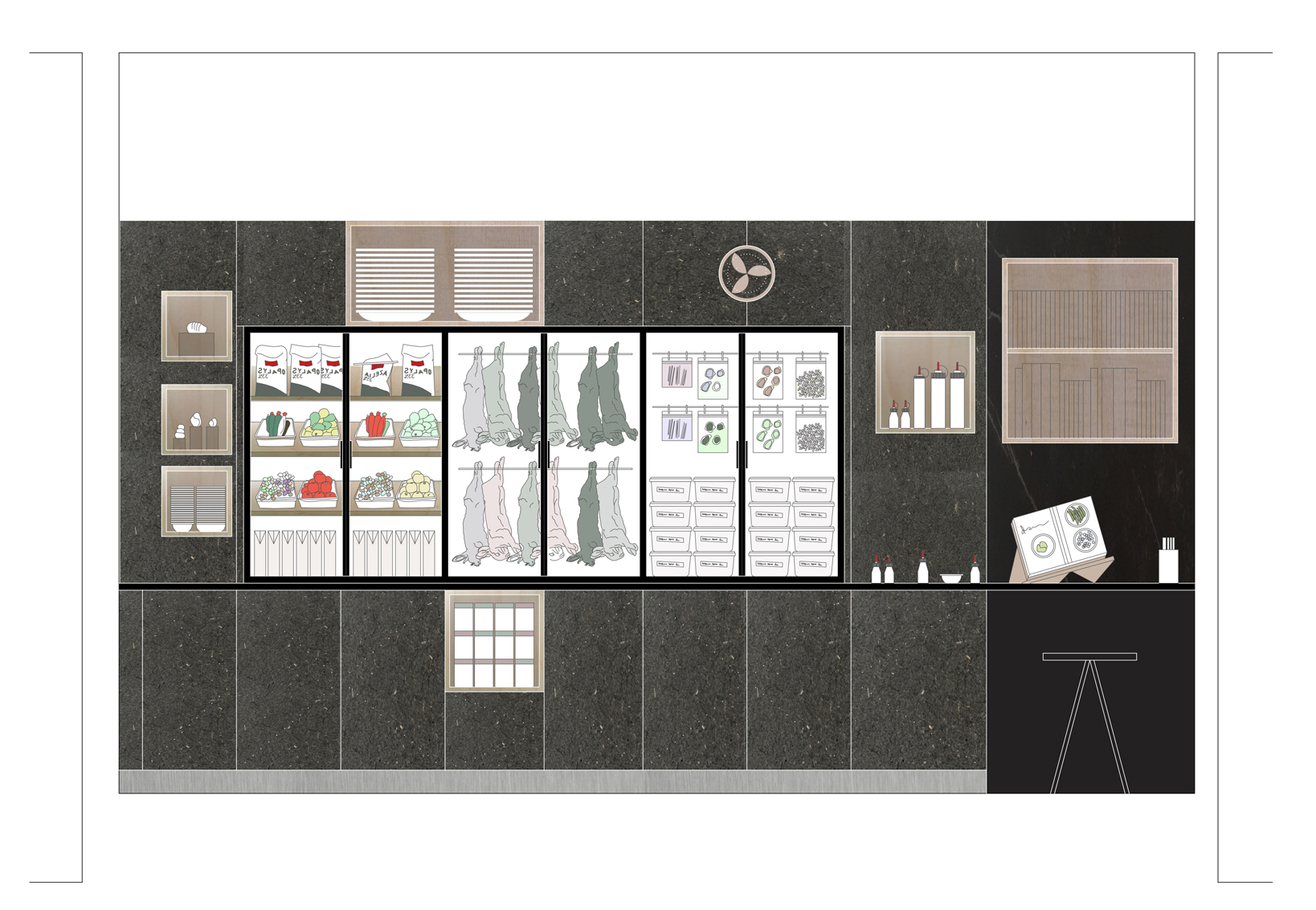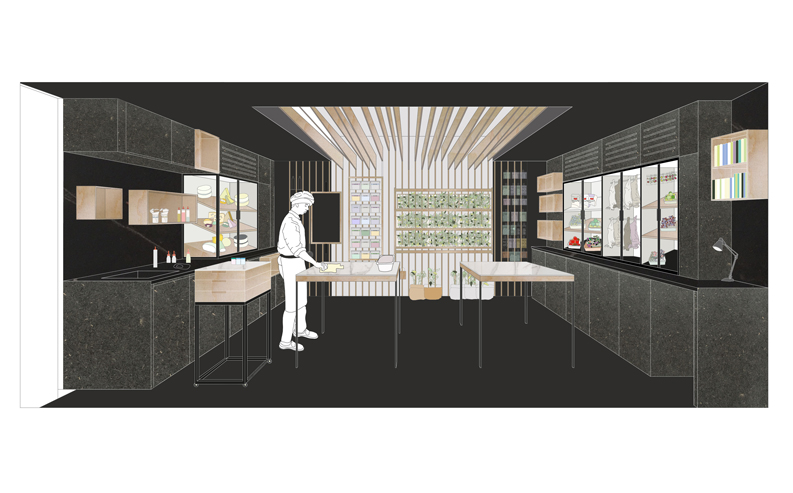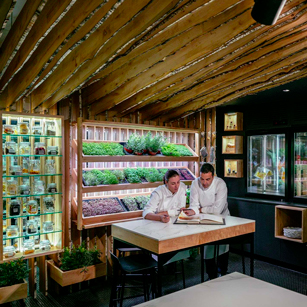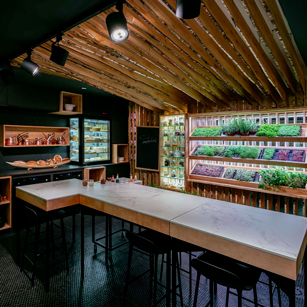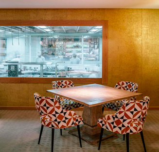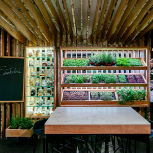 El proyecto del restaurante corre a cargo de dos estudios de arquitectura madrileños, studioD12 (www.studioD12.com) y Extudio (www.extudio.es). Basándose en las raíces del cocinero, se diseña un restaurante con varias zonas diferenciadas teniendo cada una de éstas un elemento representativo con denominación de origen manchega.