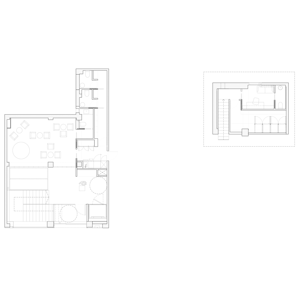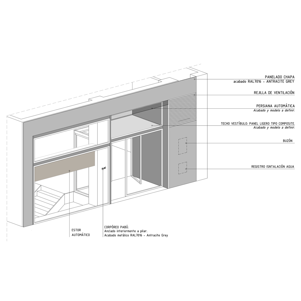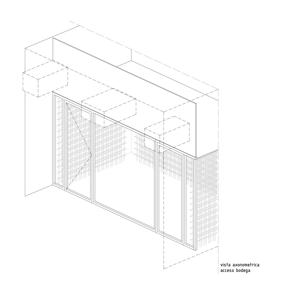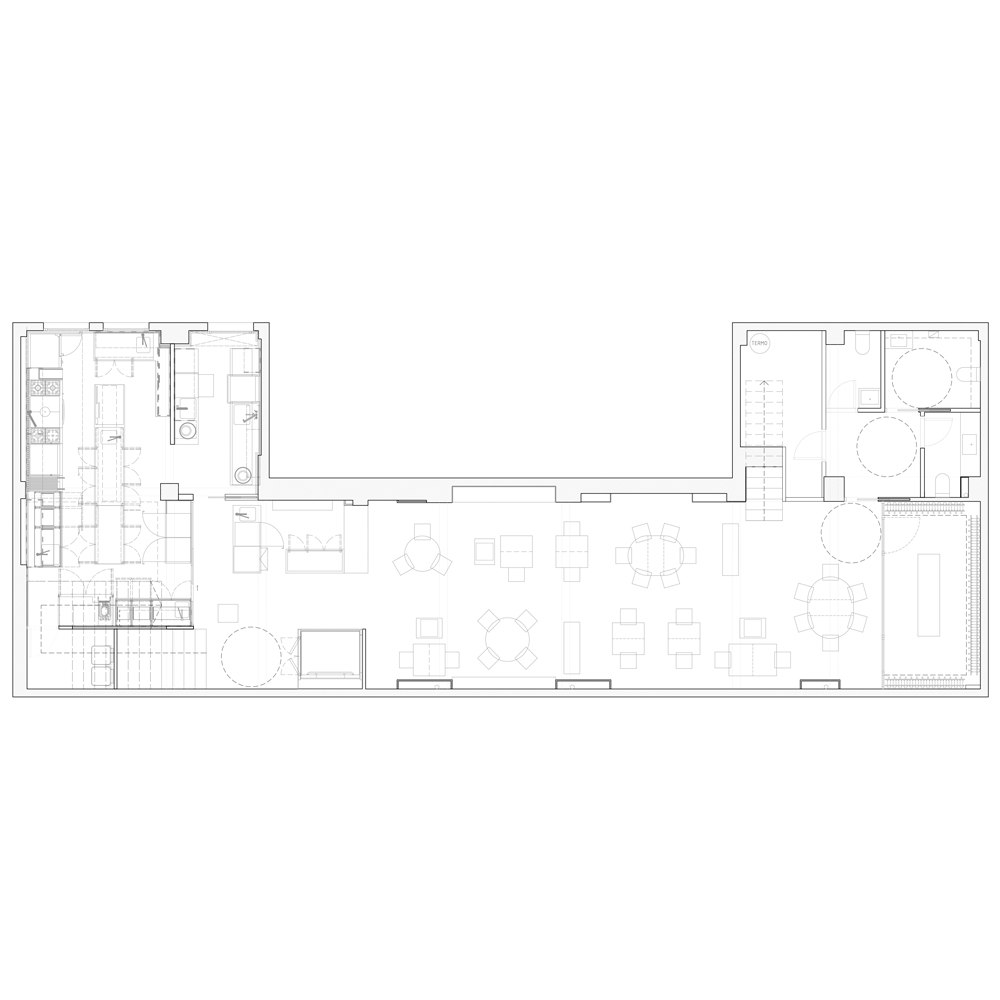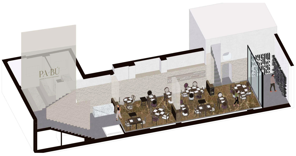 El local tiene dos plantas, siendo la planta sótano mucho mayor que la planta baja. Esta diferencia de superficies determinó que la mayor parte de la actividad tuviera que desarrollarse en la planta sótano. Este condicionante, y el deseo de que la cocina tuviera todo el protagonismo, condujeron a diseñar una fachada limpia y discreta, transparente y capaz de conectar visualmente la calle con la cocina, cubierta por un techo de vidrio que permite, incluso desde fuera, observar el orden milimétrico con el que el equipo realiza las diferentes elaboraciones. Y la entrada de luz natural.
